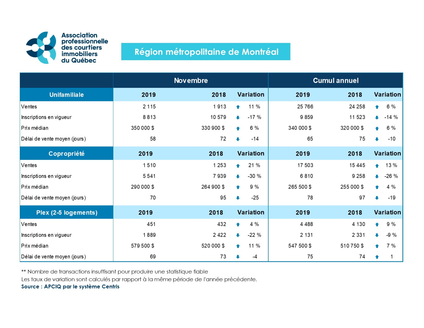 L’Île-des-Sœurs, le 6 décembre 2019 – L’Association professionnelle des courtiers immobiliers du Québec (APCIQ) vient de publier les plus récentes statistiques du marché immobilier résidentiel de la région métropolitaine de recensement (RMR) de Montréal, établies d’après la base de données provinciale Centris des courtiers immobiliers.