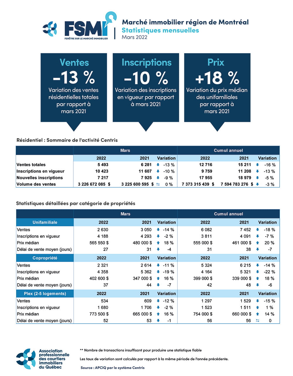 L’Île-des-Sœurs, le 5 avril 2022 – L’Association professionnelle des courtiers immobiliers du Québec (APCIQ) dévoile ses données pour le mois de mars. Les plus récentes statistiques du marché immobilier résidentiel de la région métropolitaine de recensement (RMR) de Montréal sont établies d’après la base de données provinciale Centris des courtiers immobiliers.
