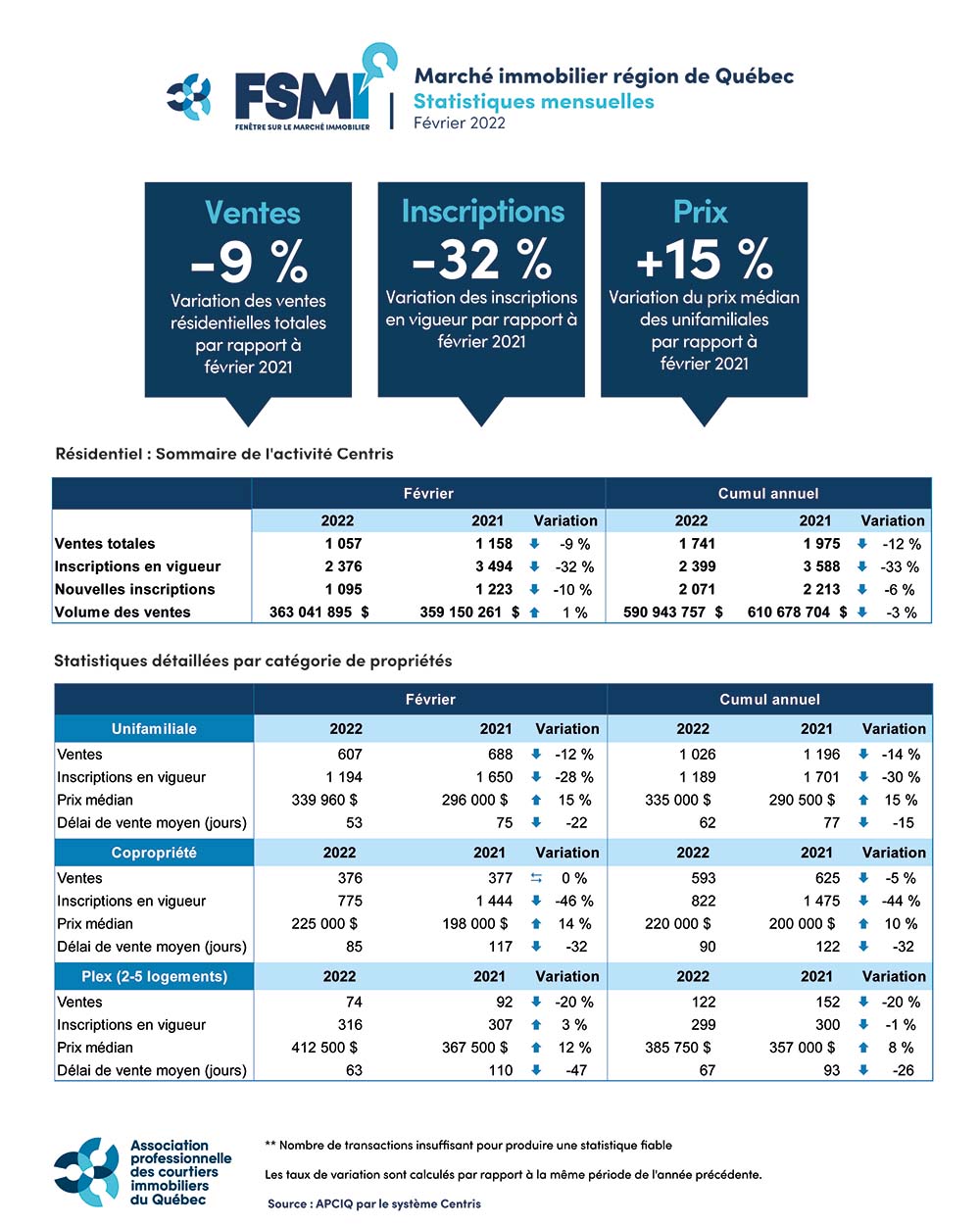 Québec, le 3 mars 2022 – L’Association professionnelle des courtiers immobiliers du Québec (APCIQ) dévoile ses données pour le mois de février. Les plus récentes statistiques du marché immobilier résidentiel de la région métropolitaine de recensement (RMR) de Québec sont établies d’après la base de données provinciale Centris des courtiers immobiliers.