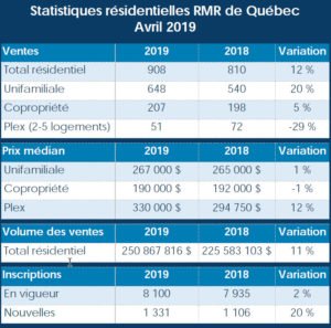 Québec, le 2 mai 2019 – L’Association professionnelle des courtiers immobiliers du Québec (APCIQ) vient de publier les plus récentes statistiques du marché immobilier résidentiel de la région métropolitaine de recensement (RMR) de Québec, établies d’après la base de données provinciale Centris des courtiers immobiliers.